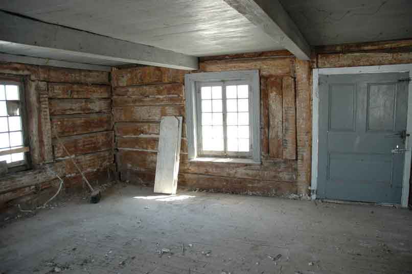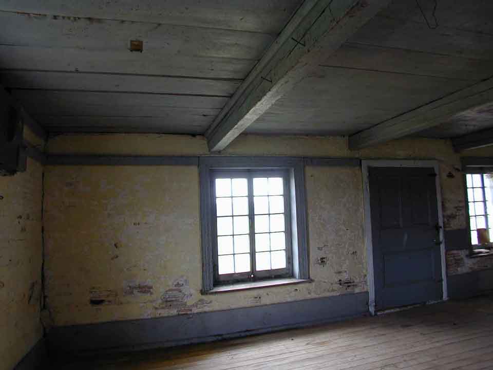 . Les murs de divisions des chambres et salle de bain au rez-de-chauss�e refait en gypse au milieu 20i�me, ont pr�sentement �t� tous d�molis, n�ayant aucune valeur historique. Les poutres de plafond du rez-de-chauss�e ont malheureusement �t� �corch�es � la hache pour les amincir lorsqu�on a construit le plafond � caisson, � la reconstruction et restauration de la maison, ces poutres devront �tres enchass�es dans des bo�tes de planches de pin si on d�sire voir les madriers de pin d�origine, ou recach�es par la reconstitution du plafond � caisson.
