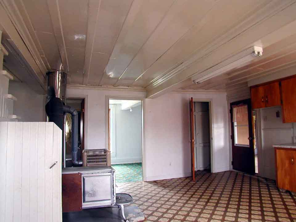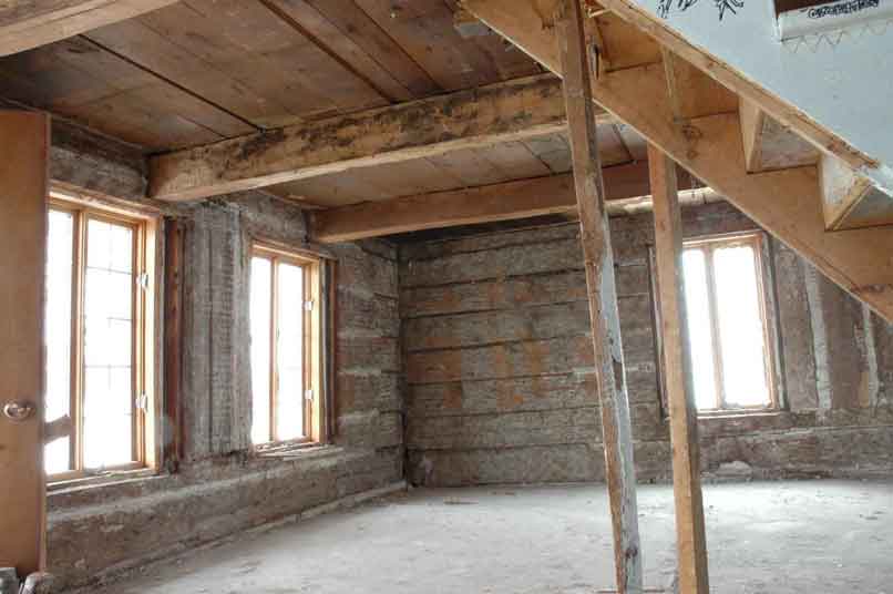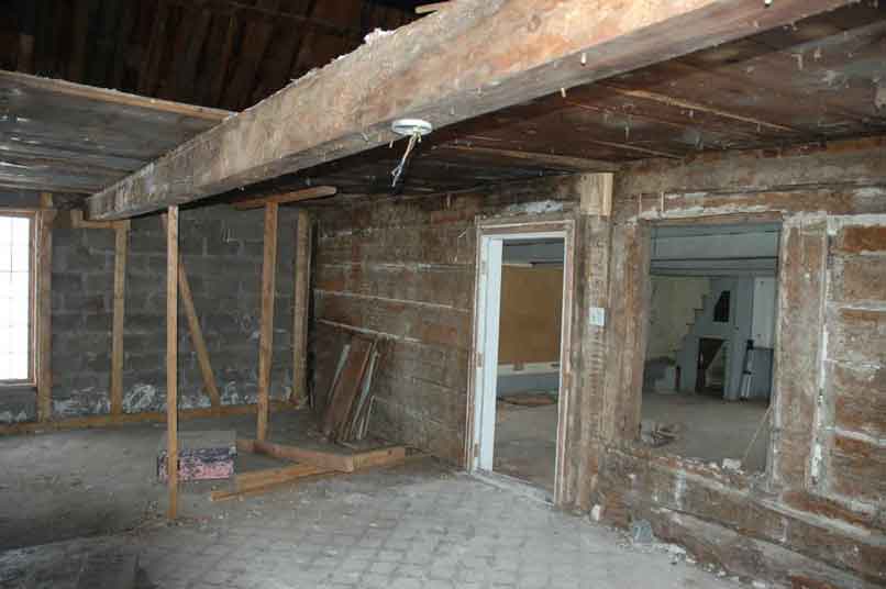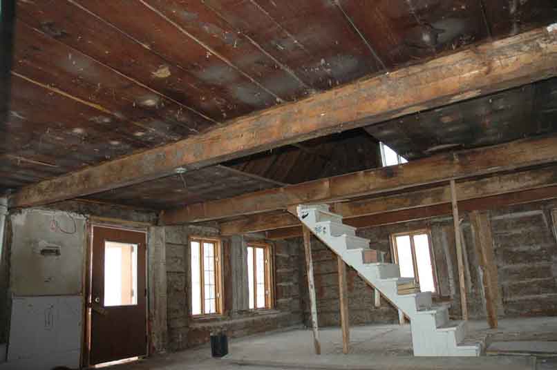 � cette �tape des travaux de curetage de l'int�rieur de la maison (25 mars 06) ;c�est une structure de maison et une charpente de toit tr�s rare aujourd�hui qui se pr�sente ici. Maison historique de la premi�re moiti� du 18i�me si�cle. Les mat�riaux de la construction d�origine de la maison sont volumineux, provenant vraisemblablement des premiers arbres de la r�gion. Plusieurs crit�res de proportions des masses de la maison t�moignent du caract�re d'influence Fran�ais de ce b�timent . Il y a beaucoup de potentiel de restauration dans cette maison, malgr� les faiblesses de mat�riaux manquants ou atrofi�s par le temps, vu la vieillesse du b�timent. Le tout est facilement r�parable.