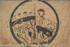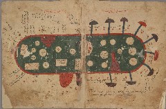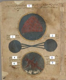 fol. 24b, The first clime, called Diyamaris: It begins near the Land of the Scorching Heat (Africa). Its zodiacal signs are Sagittarius and Virgo, and its planet is Jupiter. This is the clime of India and Far China. It starts in the east and ends in the west, spanning 180 degrees of longitude. Its width, from the vicinity of the Land of the Scorching Heat to Sarandib (Ceylon), is 285 farsakhs. Its inhabitants are the people of Far China. These people go around naked like animals, and have frightful appearances, repulsive colors, deformed bodies, sparse beards and masculine women. But they possess knowledge of incantations and omens, live long lives, and are skilful in applying herbs and minerals. In their clime one finds animals with huge bodies, and enormous birds with frightful bodies compounded from these beasts, as well as elephants, dragons, wild beasts and snakes of terrible forms, giraffes, and various types [of animals]. It is said that the phoenix is to be found in their lands. They know how to benefit from poisons and vipers� bites. Chapter 2.3 fol. 25b, In the regions south of the Equator there are nine adjoining mountains, 400 to 500 [miles] high; another mountain, which is 900 miles high. And the Mountain of the Moon, which is 1,000 miles high, and situated partly in the first clime and partly beyond the Equator, and is the source of the Nile which gushes out and branches out from it. |