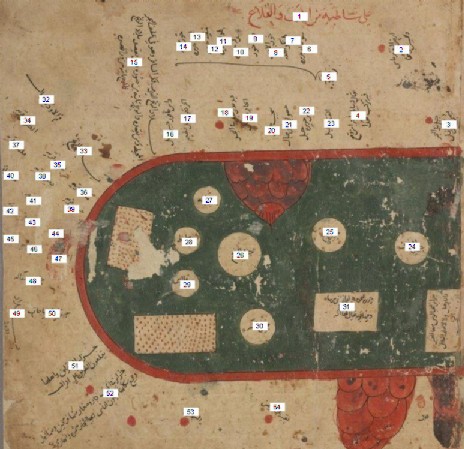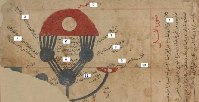 fol. 39b The seventeenth chapter on the description of the lakes. The largest lake on the face of the Earth is the lake known as the Marsh (al-batihah) on the Equator, which is the source of the Nile and its floods. It is ---- long and wide. It has a mountain that is covered with snow during winter and summer. Most Copts maintain that the sun, when in the summer it is at its zenith over this mountain, melts the snow away and causes the rise of the Nile and its perennial flow. The explanations for the rise and ebb of the Nile vary greatly. We have chosen only that which will be readily understood by the listeners, and that which is as certain as possible within the limits of our human ability. Power is with God, and we ask Him to reprieve us of any mistake or error. Map of the largest of the Nile Marshes, which is on the Equator Chapter 2.18 River Nile (1) Map of the Nile. Its course consists of ten streams, of which five are to the east and five to the west. Then it empties into two marshes, and from the two marshes into one large marsh at the equator. Then it descends to its eight outlets. It is joined [by a river] coming from the land of Zanj from a lake which is called the flask (al-qarurah) and is also known as Lake Qanbalu. Another river reaches it from the area of the Maghrib, from a spring flowing under the white sand dunes along the seacoast of the Encompassing Sea. Many rivers pour into it [this spring]. Its [the Nile�s] flow is vigorous, even when all other rivers on the surface of the land ebb - so much so that it is possible to say that it [this spring] provides it [the Nile] with waters when the it is rising. (2) Mountain of the Moon (3) The beginning of this river is at the position of 59 degrees (4) The diameter of this eastern marsh is five celestial degrees, equivalent to 284 miles. (5) The extent of this distance between the rivers is three celestial degrees, and that is 190 miles. The measurement between each of these rivers is 57 miles and two thirds of a mile. (6) This is called land of the scorpions. It has no plants or animals because of the ferocity of its heat. (7) The beginning of this river is at the longitude of 46 degrees. (8) The diameter of this western marsh is 248 miles. (9) The white sand dunes from which a river flows to the Nile. (10) The Equator (11) This marsh is in the first clime. Its position there is a spring, at 58 (deg) longitude and 2 (deg) latitude. In it there is a mountain covered with snow in winter and summer. |