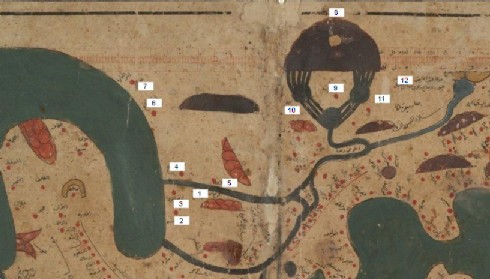 (2) Ethiopia (3) Berbera (4) Land of the Zanj (5) A river from the lake of al-Qarurah (6) Land of the Zabaj (7) End of the desert along the sea (8) Mountain of the Moon (9) The land of scorching Heat (10) the eastern Marsh (11) the western Marsh (12) This is the white sand dunes from which springs and marshes gush forth, flowing into the Nile. |