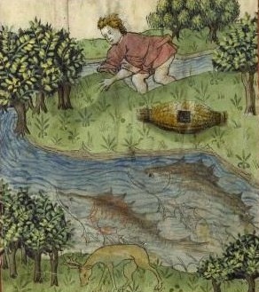 | Collecting ambergris on the shores of the Indian Ocean is also mentioned in Ibn Bultan's work on Health. This XV century german translation paints what it thinks that might have been. Even the ocean is unknown to the author who paints a river. | ||||||||||||