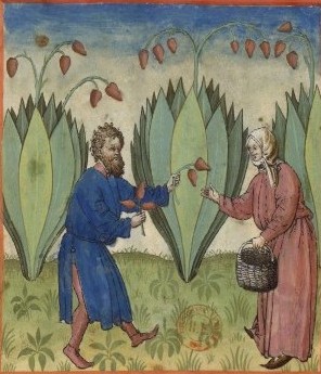 | In Ibn Bultan's work on Health he also talks about harvesting bananas. A XV th century german translation painted what they thought were bananas | ||||||||||||