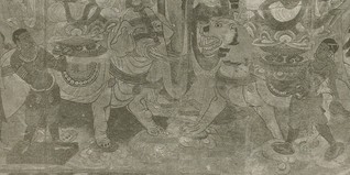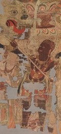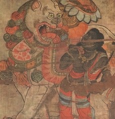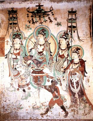 | Back to Table of Contents To next page At Dunhuang ; Cave 25, Yulin Grottoes (781-847A.D) ---------------------------------- Dunhuang is in the north-western desert of China at the crossroad of important caravan routes. On the north side of the western wall of the cave is an illustration of Manjusri Bodhisattva. Bodhisattvas are Buddha-designates or higher beings who have temporarily set aside the attainment of nirvana in order to help others find the way, and alleviate suffering. Manjusri personifies wisdom and is shown as eternally young and beautiful. Often he is as here shown riding on a tame lion held by a Kunlun (black person) |