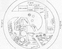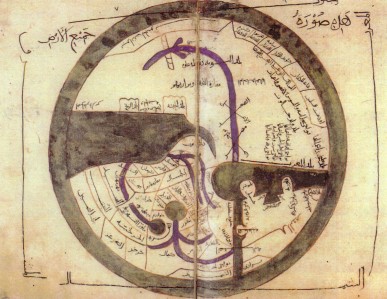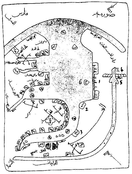 | Map of the world and variations found in different manuscripts mostly Pertsian translatons. 1 Origin of the Persian Sea 2 Land of the Zendjs 3 Desert that separates the Zendjs from the Abyssinie 4 The land of Abyssinie 5 Desert and waste of the Budja |