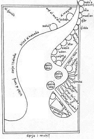 Taken from the French translation ; Configuration de la Terre. Also extracts from: - Marcel Devic; Le pays des Zendjs One of his travels brought him 20 degrees south of the equator (Sofala) along the African coast. One of the things he noted was that there were large numbers of people living in areas that the Greek said were uninhabitable. I don't mention the countries of the blacks in the Maghreb, nor the Buja, nor the Zendjs, not the other groups living in their neighborhood, because the good organization of the empires comes with religious convictions, good morals, and wise institutions, and the conservation of wealth depends on a just method of government. Or those ones neglect those qualities or they do not participate in them and so need a different place from the viewpoint of the development of the other empires. As to the largeness of the land-area, from the extreme north to the southern limit, it starts beginning from the coast of the Ocean to come to the territory of Gog and Magog, passing through the territory of the Slaves, passing the region of the interior slaves Bulgares, and the Slaves, further on the country of the Byzantins, the land of Egypt, and Nubia, stretches through the deserts between the lands of the Blacks and the Zendjs, to finish up at the Ocean.... There are Gulfs in the region of the Zendjs, as well as in the neighborhood of the lands of the Byzantins, where one also has seas, but we will not mention them because they are small in comparison with the other seas, and also because there are so many.... Abyssinie stretches along the Red sea, which is in reality the Persian sea, and which goes up to the land of the Zendjs. From the other side it is limited by the desert situated between Nubia and the Red sea, and an other frontier goes along the Buja and the un-passable desert. The territory of the Zendjs is the longest of all the Black countries, it borders the Abyssinians.... (All this he textually copied from Istakhri) The Indian empire is situated opposite the land of the Zendjs, in the eastern part of the Persian Sea.... Then this sea stretches along the Abyssinian sea, arrives at the end of the land of Nubia to get to the regions of the Zendjs, which are the biggest ones in these areas. After that the sea continues among the countries of Islam..... An extract out of a battle in upper Egypt between the forces of the emir and the tribal Buja: Qummi also has Koran verses written on banners, put up in an imposing line and attached to the lances, and he has them proclaim in the early morning; look here for you soldiers of the Buja, the messages of the emir of the believers. The Buja were arranged for battle, seeing this, they become curious and several leave the ranks to get closer. Qummi had had put the flags on the camels who carried the drums. When the Buja where among the written banners, the Zendjis start beating the drums, the ranks of the Buja are broken and they flight in disorder. This might well be one more example of Zanj mercenaries in the Egyptian army. At the altitude of Yemen basin, the sea is called sea of Aden, and this up to Aden, then it is called sea of Zendjs, and this opposite Oman where she goes towards the sea of Persia. It is a sea that becomes so large that crossing it to the land of the Zendjs is 700 parasangs. (1980 miles) It's an obscure and dark sea, under its surface nothing is visible. Close to Aden there is a fishing ground for pearls, who are brought to Aden. After passing Oman, passing the limits of Islam, and continuing to Ceylon, this sea takes the name of Persian Sea. She reaches a very big surface. On the opposite shore are the lands of the Zendjs. The land of Abyssinia ..... After that the territory continues to the land of the Zendjs, situated opposite Aden..... . Those gold mines extend (from Abyssinia) up to the land of the Zendjs along the sea..... Following certain sayings there are in the land of the Zendjs cold regions, in which white Zendjs live. I already said that this country is miserable, with few people few little cultivated lands, except for the area around the residence of the king.... The southern ocean.....passes to the south-east of Sama and Ghariwa, in a country with innumerable inhabitants, until it reaches the desert which no one has yet crossed. Between the hinterland and the regions of the Zendjs, there are big sand wastes, who formerly were passable, that was the route from Egypt to Ghana.... Nobody knows the sources of the Nil : in fact the Nil comes out of an impassable desert, from beyond the land of the Zendjs, and penetrates the region of the Zendjs, goes through the deserted and cultivated parties of the Nubia, then waters the fields uninterrupted till its arrival in Egypt. (the copier has here added) The author of the book pretends that nobody knows the sources of the Nil and that this river comes out of the deserts situated behind the lands of the Zandjs. I have seen in a geographical treatise that the sources of the Nil are situated in two circular lakes, fed by five rivers coming from the mountain Qumr. Each of those two lakes gives bird to 4 rivers who throw themselves in a circular lake in the first climate. Its diameter is divided in two parts, of which the center is at 53 deg. longitude and at 2 deg 31 min latitude of the first climate. From this last lake a river leaves, which is the Nil of Egypt made bigger by a river starting at the equator at longitude 59 deg 31'. It runs till close by Nubia..... The sand bank crosses the sea and is found again opposite Shihr and Mahra, in the land of the Zendjs, where the sand is of the same kind as the one of Shihr..... The biggest town after Chiraz is Siraf, it is nearly as big as Chiraz. The houses of Chiraz are made of teak-wood and another type that gets imported from the land of the Zendjs, the houses have several floors, like in Fostat..... In a dispute with a rich ship owner and merchant the following sentence occurs: It is rare that one