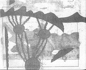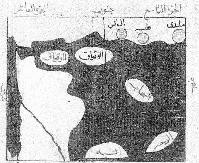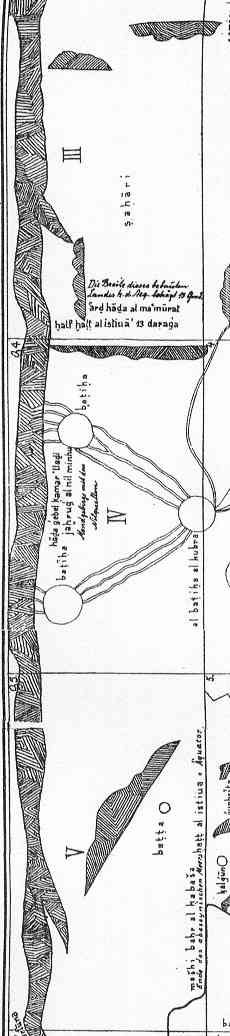 | Taken from: -Youssouf KamalTome III fasc4 -Al-Idr�s� ;Uns al-muhaj wa-rawd al-furaj /The Entertainment of Hearts, and Meadows of Contemplation. Ed. F. Sezgin Made 30 years after Idris death; Uns al-muhaj wa-rawd al-fura This last part goes up to the mountains of Djabal al-Qamar where is the origin of the Nile who goes up to Egypt�. This climate has the land of al-Zaghawa, Ghana, Kougha, Zandj and Soufala and the islands in the Indian Sea. All those are called the land of the Soudan�.. The fifth and sixth section (of the first clime) are the country called Djabal al-Qomar where the Nile starts. In the fifth section are the two small lakes who go into the big one. These two sections are sterile and no people are found there. In the fifth section starts the Djabal al Qamar which stretches to the east up to the land of Habacha. It is a very big mountain. During winter when the eastern wind is hot in Hind and in Zandj for six months, the clouds rain on these mountains, this feeds the rivers who bring the Nile Nuba and Misr into being. The Nile has its origin in the ten sources situated in the Djabal al Qamar. Five of these unite in a small lake, the other five in another small lake. Then every lake gives birth to two rivers that flow south till they reach a big lake where they unite. This lake is situated on the equator. Besides this lake is a mountain called al-Maqsam and it is from this mountain that comes the Nile of the Soudan; After this region is the one of Barbara of which the inhabitants are Soudan. Their cities are on the seacoast. They are Qaraqouna, Marka, al-Nadja, Badhouna and the villages of al-Hawiya. Between Qarqouna and Merka ther are six days by land and two days by sea. From Marka to al-Nadja it is one and a half day by sea and four days by land. From al Nadja to Badhouna is 8 days. This place is the border between the Barbara and the Zandj. The ninth and tenth section are the last part of this division. In this part is situated part of the land of t he Zandj on the east side and the complete land of Soufala. This is the extremity of the habited world in the eastern direction. |