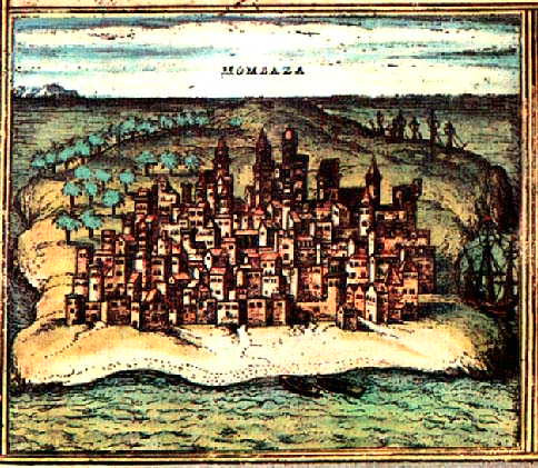 | Aden, Arabiae Foelicis Emporium Celeberrimi Nominis, quo ex India, Aethiopia ... [on sheet with] Mombaza [and] Quiloa [and] Cefala - Braun and Hogenberg, 1574. As we talk here about the History of East Africa I left behind the drawing of Aden. These drawings of Kilwa Mombasa and Sofala are although fictional among the oldest we have of these towns. The first drawing given is Sofala the second Kilwa and thirt Mombasa | |||||||||||||||