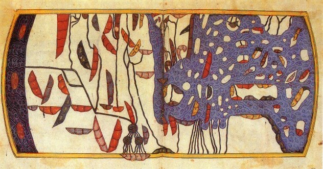 | World map of the geographers of the Caliph Al-Ma'mun --------------------------------------- Taken from : catalogue Library of Congress (map found on several websites) As contained in the Kitab masalik al-absar by Ibn Fadlallah al-Umari (d. 1349 A.D.), MS 2797/1 Ahmet III Collection, Topkappi Sarayi Library, Istanbul. Includes ancillary reconstruction of the facsimile map by Dr. Aladdin Jokhosha |