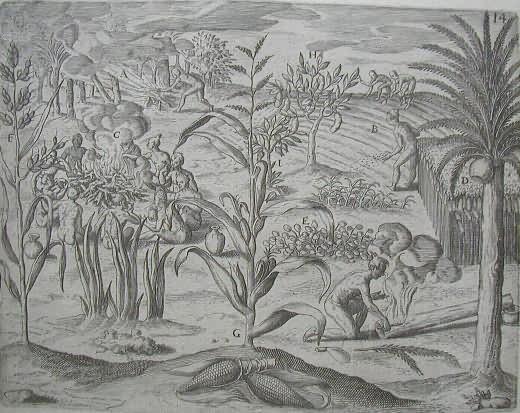 B: the natives prepare the ground for sowing. C: a fire is made form the roots of the burnt forest. When the work is finished, the people sit round and drink. D: the grain is watched over while it grows. E: here are shown growing little red and black peas. F: here rice is shown growing. G: here maize is shown growing. H: a tree where large beans grow. I: grain or �manigete�. Lastly, a palm-tree is shown. When it produces no more wine, it is cut down and the last drops burned out into a bowl. A new tree grows up from the roots of several stumps. |