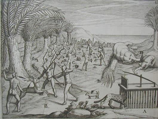 B: an antelope killed by natives using assagais. C: rabbits being caught. They are frightened out of their burrows by a lot of noise and then clubbed as soon as they appear. D: elephants fall into pits covered by straw and are unable to climb out. |