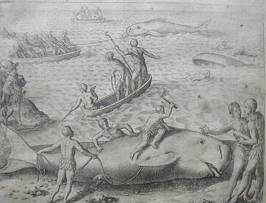 | This picture and all the others in this article do not belong to the work of Masudi they and the accompanying red text are from Theodore de Bry of Frankfurt who made them 1598-1603. They are added as illustration only How the inhabitants catch whales of the Island of Santa Marta [just off the east coast of Madagascar] When the natives of S. Marta see a whale, they row out in their little boats and throw out a rope with a large hook on the end. When the hook buries itself in the creatures flesh, the natives pull on the rope until the wound widens and the whale becomes weak, nearly bleeding to death. Then they haul it ashore and start chopping it up. Everyone could take as much meat as they needed because it was so large. |