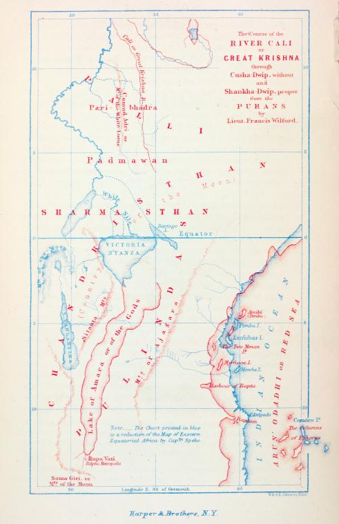 | Back to Table of Contents 2 To next page Varaha Purana (10th century) changes made till 15th. ----------------------------------- Taken from the English translation of the Varaha Purana The Puranas are part of the holy books of the Hindus. There are in fact 18 Purana books. Most of them contain several books themselves and many are thousands of pages. Most of them contain a traditional Hindu Geography. F. Wilford, in Asiatic Researches made a map(given on top with in red his constructed map and in blue what was known then from Africa) in the early 18-hundreds based on those geographies. Speake when in Zanzibar preparing for his second trip to Lake Victoria was given the map. He mentioned it in his journal full of praise for the Hindus who had found out about the sources of the Nile. In later editions of his journal the passage was left out. The importance of this map however is that Speake's first edition is published on the web, and that several Hindu-nationalist web pages also quote it. The map traces the course of a river the Great Krishna through Cusha dvipa from a great lake in Chandristhan, Country of the Moon. The district bordering lake Victoria to the east is called Amara. (a correct name, today called Massai Mara). I went through the ten thousands of pages of the Purana's and could nowhere find anything coming close to a geography of East Africa. I also went through three books who comment on the geographies of the Purana's and also found nothing. I came to the conclusion that we have here a map on which were added the names found in the Purana's that fitted best and that they were fitted there where they fit best. As an example I give part of the geography of the Varaha Purana there where it describes the country or island or continent of Cusha dvipa. Now listen to Kusadvipa, the third (continent). Kusadvipa is surrounded by a milky ocean, and is double in extent of the Sakadvipa. There are seven major mountains here also, each with two names such as Kumuda, also called Vidruma. The high Hemaparvata is also Drona, Puspavan is also Kanka, Kusesaya is also Agniman, and the sixth Mahisa is also Hari. Agni remains there. The seventh is Kakudhra; it is the same as Mandara. These are the mountains in Kusadvipa. The divisions in it have also two names each. Kumuda is Sveta, it is named first. The high Lolita is also Venumandala. Valahaka is Jimuta and is the same as Rathakara. Drona is Hari and is the same as Baladhana. The rivers there have also two names. Pratoya is also called Pravesa. The second is Siva, also called Yasoda. The third is Citra, also known as Krsna. The fourth is Hradini, also called Candra. The fifth is Vidyullata, also called Sukla. The sixth is Varna, it is the same as Dhrti. These are the main rivers. The others are minors ones. This is the arrangement in Kusadvipa. Note: Sircar D. C. has in several of his books put forward the idea that Kusadvipa is related to Kush; the country on the Nile between Egypt and Ethiopia. It got to be known in India as it was the border of the neighboring Persian empire where several inscriptions mention it. According to numerous authors (but not all) East Africa should be Sancha dwipa. The following extract is taken from: Asiatick Researches: Or, Transactions of the Society Instituted in Bengal, for Inquiring Into the...By India Asiatic Society Calcutta P307-308 (1808) The dwipa of Sancha is supposed, by the Pauranics, to join the island of Sumatra, or of the Moon. This mistaken notion has been adopted by Ptolemy, and after him by Oriental writers. In the beginning of the Brahmanda-purana, Lanca or the peninsula of Malaya, and Sumatra join the island of Sancha, or Zengh�.. The tract of islands called Raneh by Arabian writers, and including Madagascar and the surrounding islands, is obviously the dwipa of Harina, mentioned in the Bhagavata, along with Sancha, in the South-West quarter of the old continent. This island being also called in Arabic, the island of the moon, has occasioned some confusion. |
