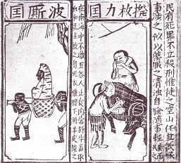 | Back to Table of Contents To next page Tuan Ch'eng-Shih (863) (Yu-yang-tsa-tsu) (assorted dishes from Yu-Yang) ----------------------------------------- The picture left is from the 1600 Ming encyclopedia. The picture with the cow and two men has written on the top Po-mei-li-kuo (the name of the unidentified country in the south sea) The inscription to the left of this picture : These people in the south seas are not acquainted with the five cereal crops. They eat only meat, and are accustomed to pierce their cattle for blood, and this they drink unboiled with milk. They do not wear clothes, but use sheepskins to cover their lower parts. (I did not find any description of the picture of two black man carrying a third one. ) |