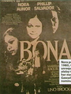 | NOTES: Bona was one of Nora's two entries to the 1980 Metro Manila Film Festival. The other was Kung Ako'y Iiwan Mo directed by Laurice Guillen. It's not unusual for her to have two movies in the festival. In 1979, she was in Ina Ka ng Anak Mo and Kasal-kasalan, Bahay-bahayan; in 1978, she was in Atsay and Jack N Jill of the Third Kind with Dolphy. In both instances, a drama movie and a comedy movie. A pretty good strategy since the comedy film will top the box-office and the drama will win awards. With the 1980 filmfest, Nora was in two dramas by respected directors - Brocka for Bona and Laurice Guillen for Kung Ako'y Iiwan Mo, her next movie after her highly praised directorial debut Kasal. With Nora's triumphs from the past two years, I was expecting her to win the Best Actress award once again. Vilma Santos' entry was Langis at Tubig directed by Danny Zialcita. But everyone was blown away by the movie Brutal directed by Marilou Diaz-Abaya. Amy Austria won the Best Actress award that year. Bona was shown at the Cannes Filmfest as an entry to the Director's Fortnight. Nora won the Urian Best Actress award for Bona but she had to share it with Gina Alajar who was also recognized for her performance in Brutal. |