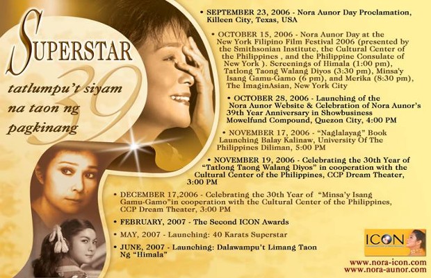 The Official Website for The One and Only Superstar Ms Nora Aunor Click here for a preview. Launching on October 28, 2006 |