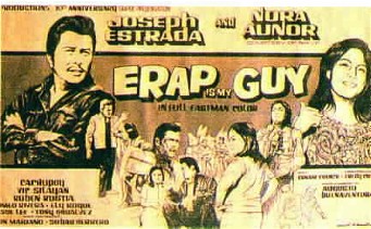 | ERAP IS MY GUY (1973) Cast: Nora Aunor, Joseph Estrada Shown: March 30, 1973 Nora and Joseph Estrada's first team-up. And take note Nora's name is billed a bit higher than Joseph Estrada. Click here for screencaps from the movie. Click here for a video clip of Nora and Joseph Estrada singing the song Kahit na Magtiis posted on YouTube. |