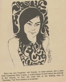 | Nora has not forgotten old friends. In some parties, she is seen with handsome Rico Lopez, a co-bit player of hers when she started in the movies. In fact, she took him as her leading man in Carmela, her first venture as a producer. | ||||||||||||||||||||||