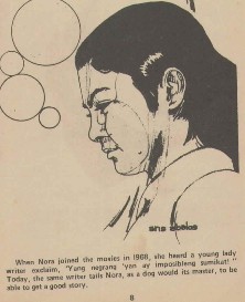 | When Nora joined the movies in 1968, she heard a young lady writer exclaim, "Yang negra'ng 'yan ay imposibleng sumikat!" Today, the same writer tails Nora, as a dog would its master, to be able to get a good story. | ||||||||||||||||||||||