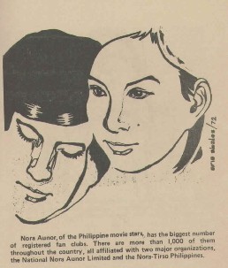 | Nora Aunor, of the Philippine movie stars, has the biggest number of registered fan clubs. There are more than 1,000 of them throughout the country, all affiliated with two major organizations, the National Nora Aunor Limited and the Nora - Tirso Philippines. | ||||||||||||||||||||||