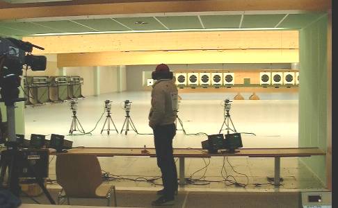 | A competitor firing a series during the Munich World Cup in 2000. Each competitor has a bank of five targets and must fire a shot on each in the relevant time limit. |