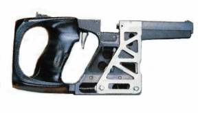 | This is the pistol that caused a furore at the 1956 Olympics and led to a change in the rules for the Rapid Fire Match. There is actually very little about it that is revolutionary. It is simply a Margolin pistol which has been turned upside down, a longer barrel fitted, the trigger relocated and the grip so arranged that the barrel position is very low in relation to the hand. The barrel is on the bottom in the picture above and the sights are set on a ramp on the top. The pistol was nicknamed the "Hacksaw" pistol for obvious reasons. The rule changes made after these games limited pistols to a size which would fit into a box 30cm x 15 cm x 5 cm, and the centre line of the barrel bore had to pass above the hand, in the firing position. Ironically, these changes ultimately led to the development of a pistol which was truly revolutionary and which eventually led to the elimination of all muzzle lift in Rapid Fire pistols. |
