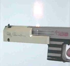 | A close up of Ralf Schumann's pistol during firing, showing clearly the escape of gasses from the barrel vents. Also seen is the blur of the cycling bolt just to the left of the red Pardini brand |