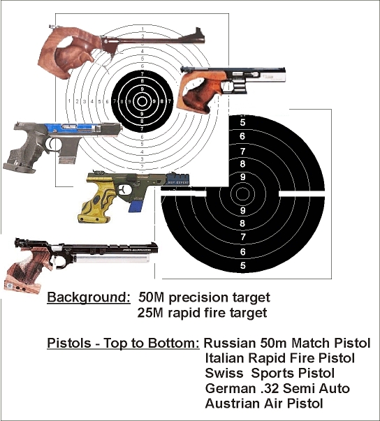| In the 18th and 19th centuries, as pistols became more sophisticated, they were adopted by duellists, instead of swords, although swords continued to be used for this purpose right through to the 20th century. The popularity of a pistol for this dangerous and often lethal activity, lay in the fact that a pistol was relatively easy to master and virtually anyone who could afford pistols, could become a proficient marksman in a fairly short period of time, whereas becoming an effective swordsman took years of practice and not a little intrinsic talent. By the late 19th centruy, the concept of excellence in marksmanship for its own sake became established as a sporting ideal and contests were held to determine the best marksman in a town, city, county or country. The prizes for the winners of these competitions had become trophies or medallions, but the real prize was the widespread prestige that was bestowed on the winners of these contests. It is hardly surprising that Europe took the lead in the development of the marksmanship sports into an art form. Even today, in almost every country in Europe, shooting contests with pistols, rifles and shotguns are highly regarded sports which attract a huge following. Today, the sport of target pistol shooting is a world-wide phenomenon in almost every country of the world. It is now a highly refined sport which is governed by the International Shooting Sports Federation (ISSF) based in Switzerland. There are pistol shooting events at the Olympic and Commonwealth Games. In fact, pistol shooting was one of the inaugural sports of the modern Olympics, which began in 1896. Baron Pierre de Coubertin, the "father" of the modern Olympics, was the French National pistol champion and so, not surprisingly, he included pistol shooting in the new Olympic program and there it has remained ever since. The type of shooting events conducted at the Olympic and Commonwealth Games are now referred to as the ISSF target pistol sports. At the Olympics, the following pistol events are conducted: The 50 Metre Match (Free Pistol Match); the Rapid Fire Match; Women's Sports Pistol Match; Women's Air Pistol Match and Men's Air Pistol Match. At the Commonwealth Games, the Olympic matches are conducted as well as the following two matches: The International Centre Fire Match; The Standard Pistol Match A description of each of these matches can be found on the web page titled "The Pistol Matches" |