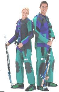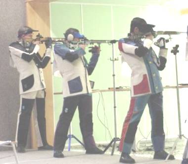 | Both Air Rifle shooters and Smallbore shooters use specialised clothing to help them in their respective matches. The clothing is identical for either discipline. The photo shows competitors wearing jackets, trousers and boots. Soon the ISSF rules will be changed such that the trousers will be banned but jackets and boots will still be permitted. Shooting jackets are now made from a colourful combination of very stiff double layered canvas and leather. Shoulder and elbow pads are covered in a special non-slip rubber compound. The jackets and boots do help the shooter to maintain a steady stance, but are not really essential. |
