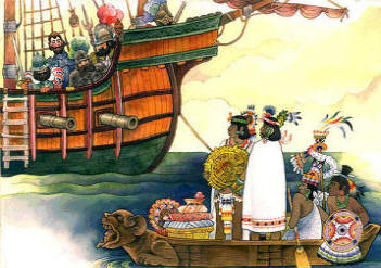 ayuda de los intérpretes, que los españoles han adiestrado en la