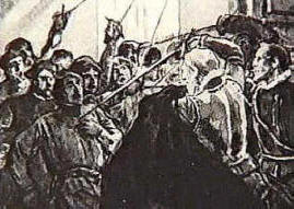 a la hora de la misa, un bullicioso grupo de 21 complotados, cruzó