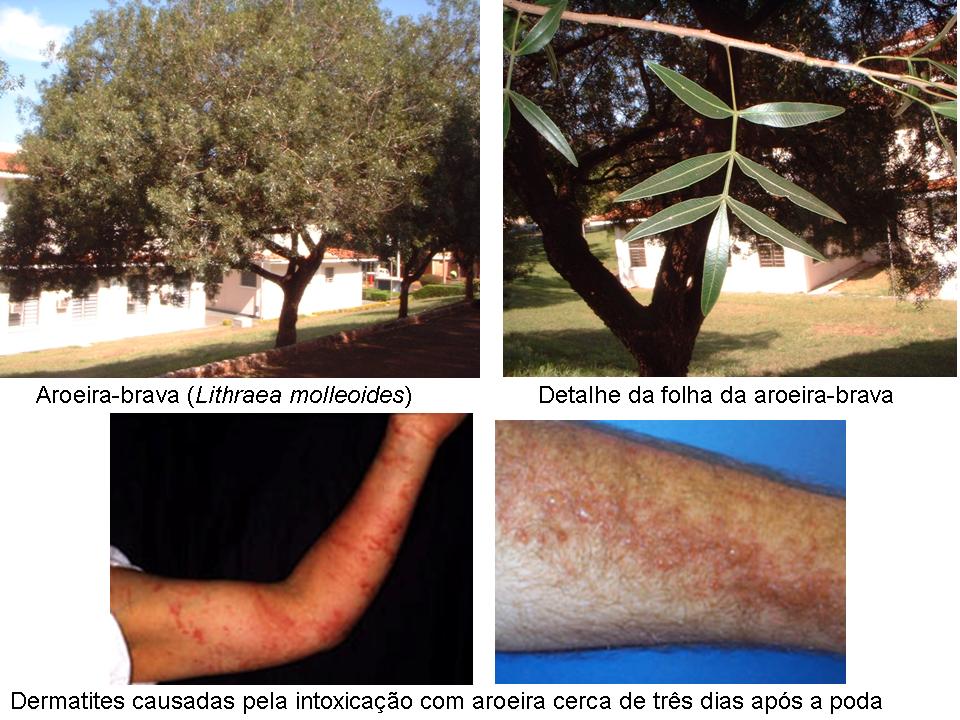 Do gênero Lithraea, a espécie Lithraea molleoides é responsável pelos casos mais graves de dermatites fitogênicas. Estas dermatites são caracterizadas pr coceira e aparecimento de bolhas na pele. Tais sintomas são desencadeados por ação alergizante, na qual as lesões dependem da prévia sensibilização do sistema imunológico (Ellenhorn & Barceloux, 1988). Os componentes alergênios de toda a família estão dentro de um grupo de substâncias denominadas coletivamente de "urushiois". Quimicamente, trata-se de substâncias com núcleo catecólico e de cadeia alifática saturada ou insaturada, com 15 a 17 átomos de carbono. São extremamente lipofílicas e acumulam-se nas membranas celulares. In vivo, são oxidadas a quinonas eletrolíticas que se comportam como haptenos e reagem com proteínas da pele para formar antígenos, provocando reações de hipersensibilidade (Ale et al., 1997). Logo a seguir, células T são ativadas e carreiam os complexos formados pelas proteínas com os urushiois para o retículo endotelial, onde fatores humorais irão produzir um estado generalizado de sensibilidade cutânea (Kalergis et al., 1997; Baldwin et al., 1999). Quatro 3-n-alquilcatecóis (3-pentadecilcatecol, 3-pentadecinilcatecol, 3-heptadecinilcatecol e 3-hepta-dec-dienilcatecol) relacionados foram identificados por Ale et al. (1997) como sendo os princípios ativos responsáveis pela toxidez de L. molleoides e L. brasiliensis Marchand.
