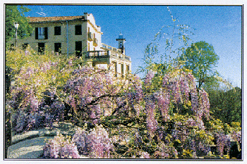 Il Ricetto visto dal ponte, con il Glicine fiorito, il Municipio e la chiesetta della Confraternita dell'Annunziata
