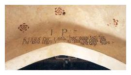 Nell'aula, sul lato opposto alla porta di ingresso laterale ed in prossimit� del muro di divisione � dipinta una lapide: questo affresco � stato eseguito recentemente e riprende il contenuto della lapide murata poco al sotto ed in cattive condizioni di conservazione.