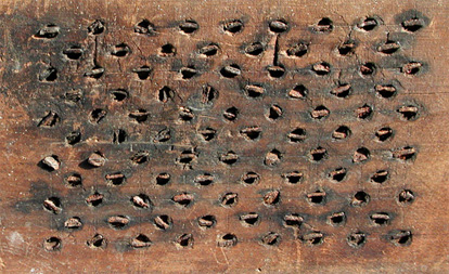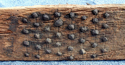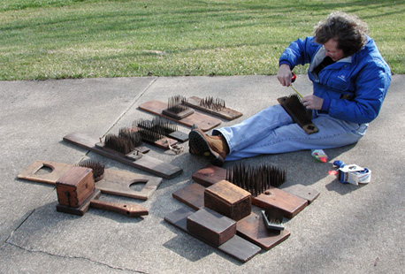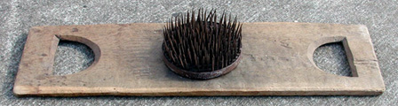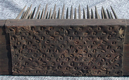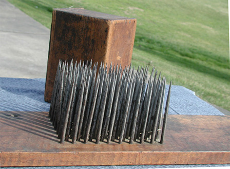Compare the square nails on this comb to the comb just above it. To insert the nails into the board, the maker probably first drilled small pilot holes at the points he wished to place a nail. He would then heat the nail to red hot and plunge it into green wood burning its path as it went and forming a perfect fit. Timing is everything. The nail must be cooled as soon as it is seated to stop burning the wood. When the wood dries it will shrink about the nail forming a fit as tight as can be achieved with modern glues.