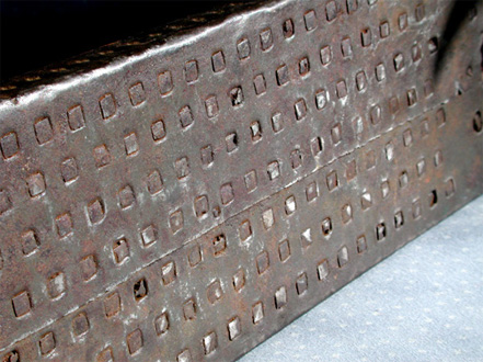 The bottoms of combs can tell a lot about the item. image above shows a diagonal pattern of round tines. It is easy to see that the tines were spikes and probably never had nail heads. The comb below shows a similar pattern but were driven through a sheathing of tin.
