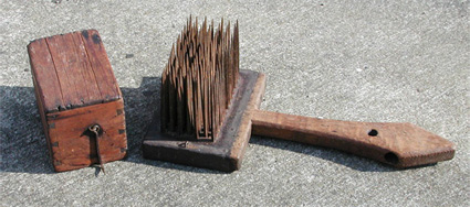Below is a comb whose tines are made from round stock. The wooden box was used to protect the tines from becoming bent or broken (not to mention puncturing human parts that got too close). Some boxes will contain a handful of flax tow which prevents rust from forming on the tines.