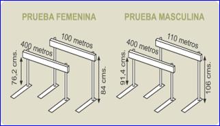100 metros femenil En la carrera de 100 metros, la primera valla está a 13 metros de la línea de salida, el intervalo entre las vallas es de 8,5 metros y hay una distancia de 10,5 metros entre la última valla y la llegada. La valla tiene una altura de 84 cms. 110 metros varonil |