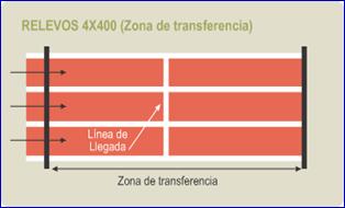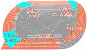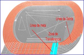 El pase de la estafeta debe tener lugar dentro de una determinada área de 20 m., llamada zona de transferencia o pase. Si el pase no tiene lugar dentro de esa determinada área, el equipo será descalificado. |