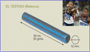 Testigo o Estafeta Un tubo llamado "testigo" se pasa del primer corredor al segundo y así sucesivamente. El testigo de relevos es liso y hueco, de unos 12 mm. A 13 mm de diámetro y 30 cm. de longitud máximo 28 cm. Como mínimo. Puede estar hecho de madera, metal o plástico y pesa sólo 50 gr. Generalmente son de colores vivos para que sean más fáciles de ver. Se usa tanto el la prueba de 4x100 como en la de 4x400m . |