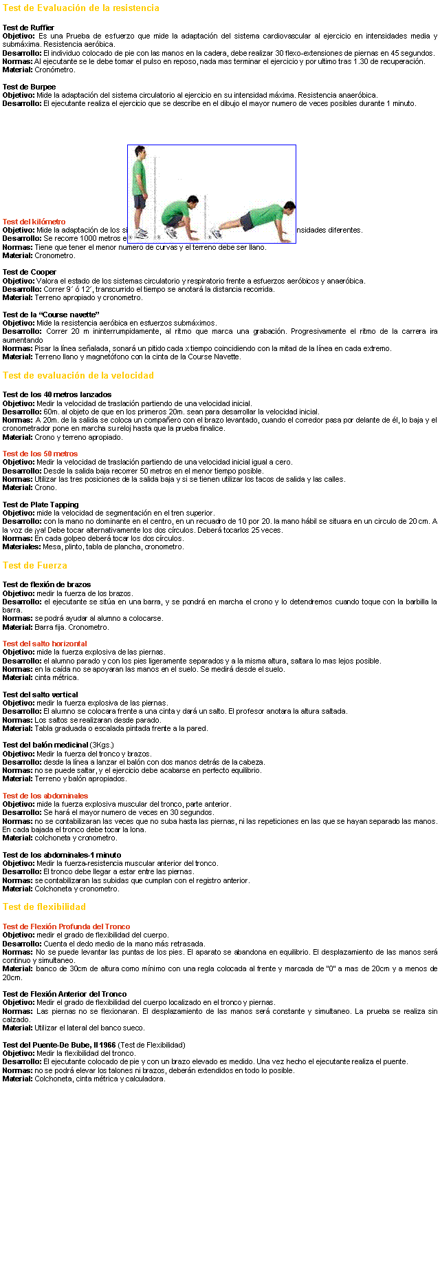 A lo largo del curso se pretende que trabajes principalmente la fuerza, velocidad y resistencia como capacidades físicas condicionales y la flexibilidad como capacidad física coordinativa; aunque también trabajarás la coordinación, el equilibrio y el ritmo. Para ello se aplicarán distintos métodos del entrenamiento para el desarrollo de estas capacidades y en esta sección se pretende que aprendas y/o conozcas más acerca de estas capacidades, sus métodos de desarrollo y algunos test de evaluación de las mismas. |