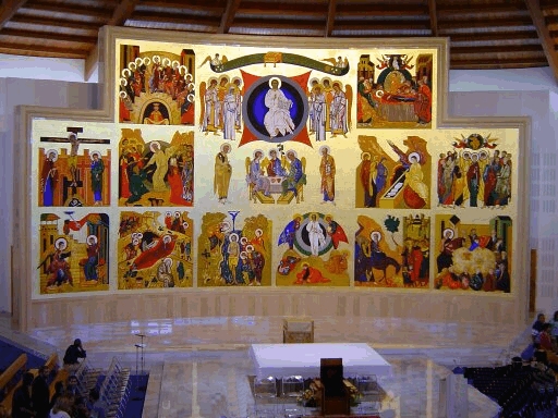 Hay un canon que el pintor no puede inventarse nada. El canon de la Iglesia de Oriente la han hecho los padres, los teólogos, no los pintores que son los padres de esa… Esa forma de hacer la Anunciación, no se lo ha inventado Kiko Argüello. Es exactamente como lo hace Rublev. Rublev que ha sido canonizado por la Iglesia Ortodoxa. Es un pintor eh… muy Santo, un monje, que ha hecho… bueno… pues en todos los iconos si veis… si vais a Rusia y veis la Anunciación así, entonces… aquí está primero…. preside este gran retablo la Segunda Venida de Cristo. Es muy importante unir Arte y Liturgia. Nuestra Misa, nuestras Iglesias, son pobres en ese sentido, tenemos todavía una estética barroca, del barroco de hace mucho siglos. Nos hace falta una estética moderna, nueva…podemos equivocarnos, quizá, estamos en una…abriendo caminos.