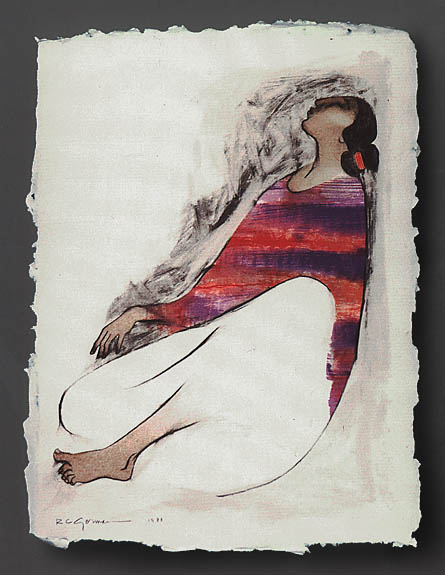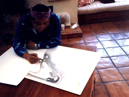 This is an example of the plates that were created by RC Gorman at his studio for a serigraph printed at PrintMaster Studio. It was composed of a combination of both hand drawn details and hand painted brustroke washes. A separate plate is used for each color. The plates are transparent so they can be superimposed one upon each other as each successive plate is drawn or as a wash is applied. So the image is built up in layers.
