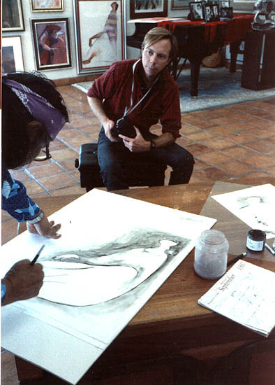 Here the artist perfects his plates with the printmaker in the background ready to offer assistance as needed, and photographs. Behind him to the right of the piano, very small is the original pastel, from which this serigraph was loosley translated.