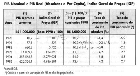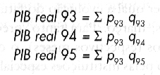 Como se observa, só as quantidades variaram, enquanto os preços permaneceram fixados em 1993, como se a inflação fosse zero desde então. Nota-se também que no ano-base 1993 o PIB real e o nominal eram iguais. Assim, quando comparamos o PIB real nos vários anos, temos o crescimento real, ou da produção fisica, livre do efeito da inflação. Para transformarmos uma série nominal em uma série real temos de deflacionar a série nominal. Isso pode ser feito para qualquer série monetária (salários, impostos, custos de produção, faturamento da empresa, depósitos etc.). Para tanto, precisamos encontrar um índice de preços (deflator) que represente o crescimento da inflação no período. No caso do PIB, aplicamos a fórmula: PIB rea =