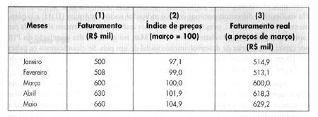 x e obtemos uma nova série para o índice, o que nos permite calcular o faturamento a preços de março, como mostrado na tabela a seguir: