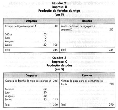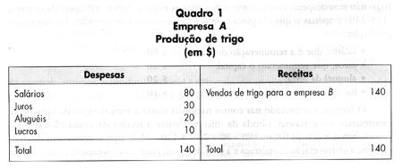Consideremos, inicialmente, apenas o balancete da empresa A. Do lado esquerdo do quadro encontram-se relacionadas as despesas necessárias para a produção de $ 140 de trigo. Por simplificação, e supondo que só existam as três empresas citadas, o setor trigo não tem despesas com a compra de matérias-primas. Assim, a despesa da empresa A ($ 140) é apenas o que ela gasta com o pagamento ou remuneração dos fatores de produção: * salário,