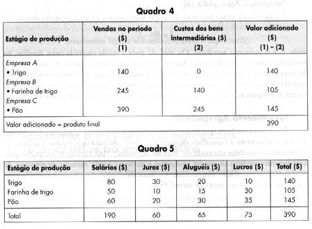 + Juros + Aluguéis + Lucros onde w = wages = salário. Se somarmos todos os pagamentos de salários, juros, aluguéis e lucros das três empresas do exercício anterior, chegaremos novamente ao valor de $ 390. Observamos, finalmente, a identidade básica das contas nacionais: Produto nacional = Despesa nacional = Renda nacional ou: PN = DN = RN No exercício, consolidando as três empresas, temos que: PN = DN = RN = 390 Isso ocorre porque, como os bens intermediários acabam se anulando (venda de empresa a empresa), tudo o que a empresa recebe (PN = DN), ela gasta na remuneração aos fatores de produção (RN), que inclui o lucro dos empresários, igualando o fluxo do produto e o fluxo dos rendimentos. Essas são as três óticas de medição do resultado da atividade econômica de um país num dado período. Em termos operacionais, entretanto, a forma mais prática utilizada pelos estatísticos é a do valor adicionado, que veremos a seguir. Valor Adicionado Valor adicionado (ou valor agregado) é o valor que se adiciona ao produto em cada estágio de produção. Somando o valor adicionado em cada estágio de produção, chegaremos ao produto final da economia. No Quadro 4, o valor adicionado é encontrado por diferença (valor das vendas menos os custos dos bens intermediários). No Quadro 5, o valor adicionado é dado pelo somatório da remuneração dos fatores de produção, alocados nos três estágios da produção do pão (trigo, farinha de trigo e pão),o que dá, evidentemente, o mesmo resultado.