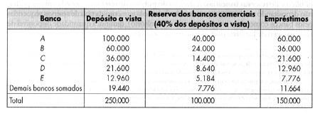 Como observado, a oferta inicial de moeda manual de até $ 100.000 transformou-se em uma oferta total de moeda escritural (depósitos a vista) de $ 250.000. O efeito multiplicador da moeda escritural é dado por uma progressão geométrica decrescente. De uma forma mais simples, ele é dado pelo inverso da porcentagem da reserva bancária, ou: m = 1/r onde: m = efeito