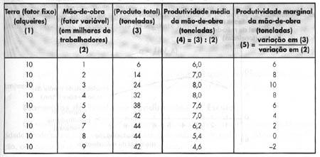 Quadro a seguir ilustra os conceitos acima definidos: O quadro foi construído colocando-se, arbitrariamente, números no exemplo dado, para as três primeiras colunas. Os valores das duas últimas colunas decorrem das anteriores. Verifica-se que, de início, podem ocorrer rendimentos crescentes, isto é, os acréscimos de utilização do fator variável provocam incrementos na produção. A partir da quarta unidade de mão-de-obra incluída no processo produtivo, começam a surgir os rendimentos decrescentes. A oitava unidade, associada a 10 unidades do fator fixo terra, maximiza o produto (44 unidades). A produtividade marginal dessa oitava unidade é nula. Daí por diante, cada unidade do fator variável mão-de-obra, associada às 10 unidades do fator fixo terra, passará a ser ineficiente, ou seja, sua produtividade marginal torna-se negativa. Tais relações permitem o traçado dos seguintes gráficos, cujos formatos se devem à Lei dos Rendimentos Decrescentes: